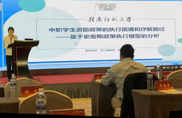 2023级教育学专业研究生李攀在第三专题会场做了题为“中职学生资助政策的执行困境和纾解路径——基于史密斯政策执行模型的分析”的报告。该报告以史密斯政策执行模型为支撑,从政策本身、执行主体、目标群体以及执行环境四个方面分析当前中职学生资助政策存在的困境,并提出了完善资助政策内容体系、加强执行机构管理能力建设、科学准确传达政策目标和优化社会文化生态环境等优化路径,学术报告获得了与会专家的好评。